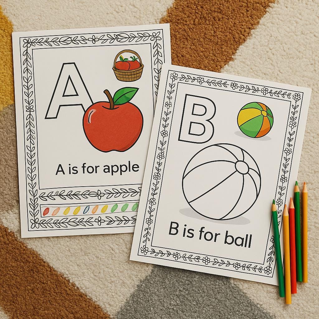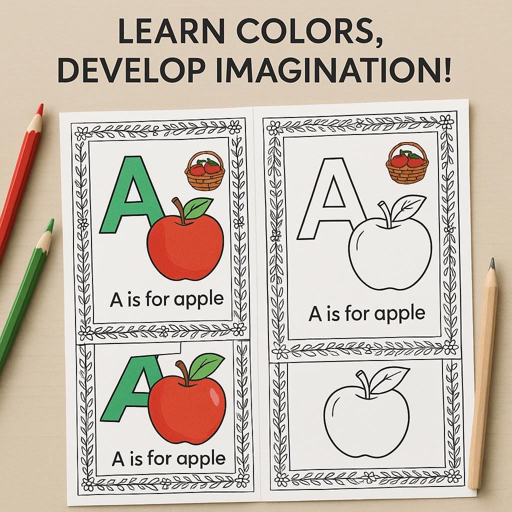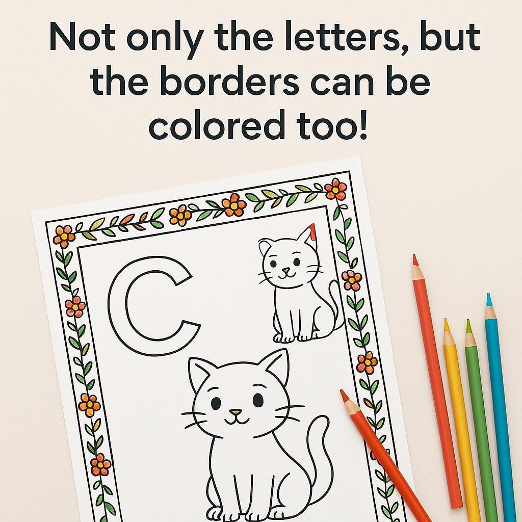 - Colorable borders and fun images to enhance letter recognition and fine motor skills