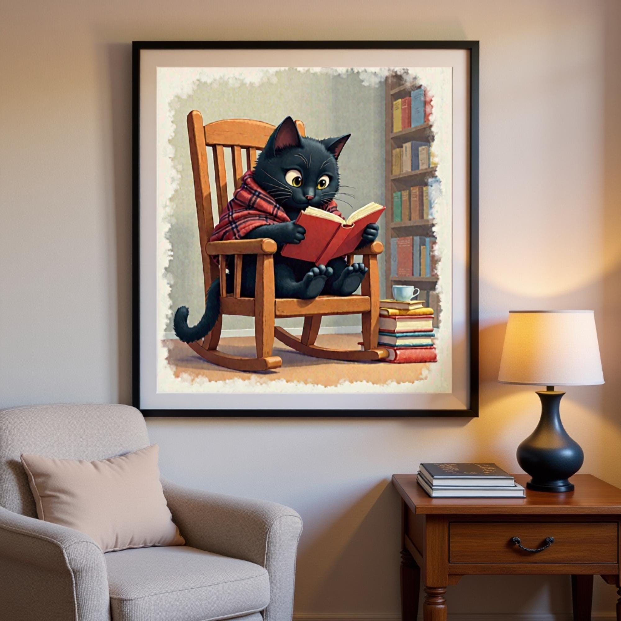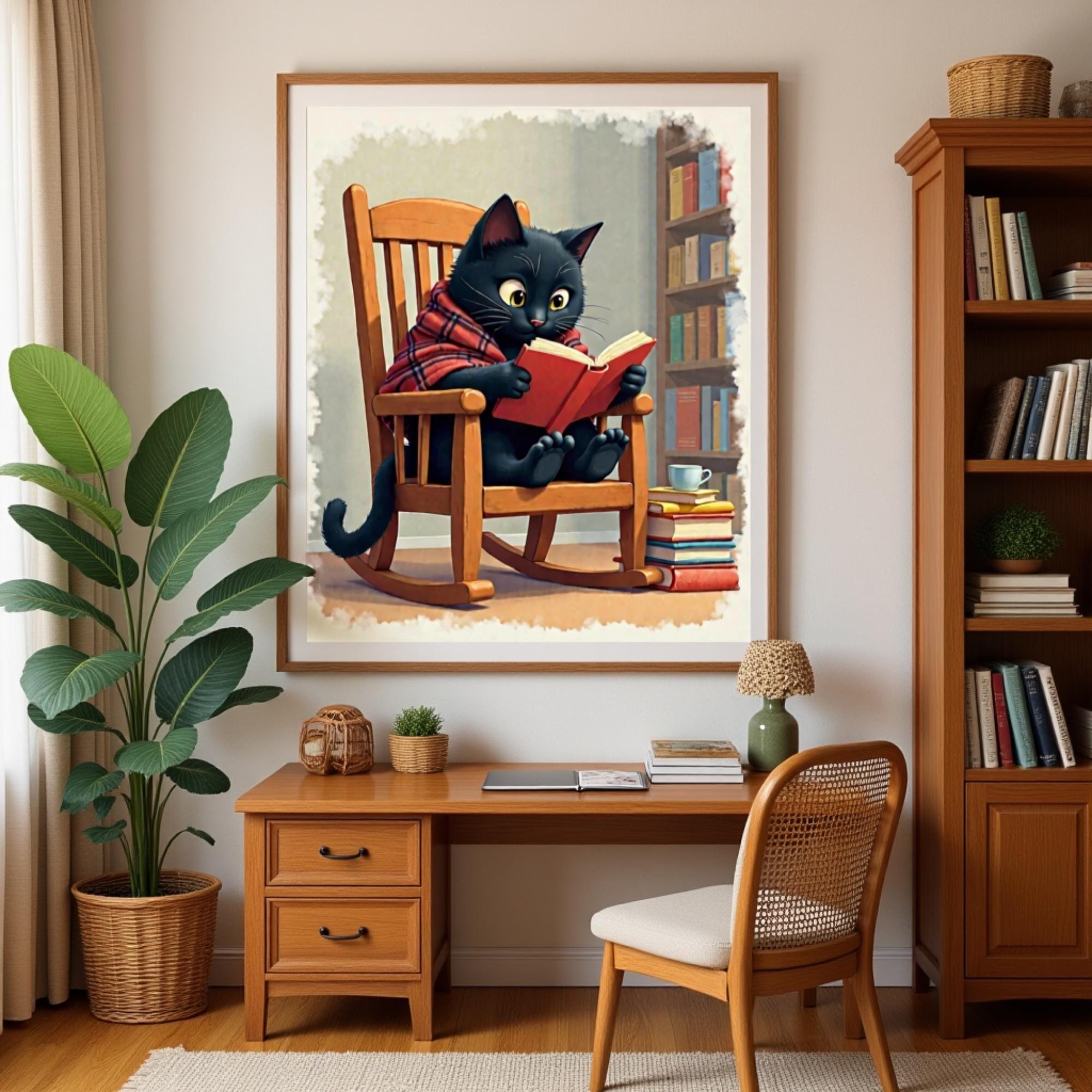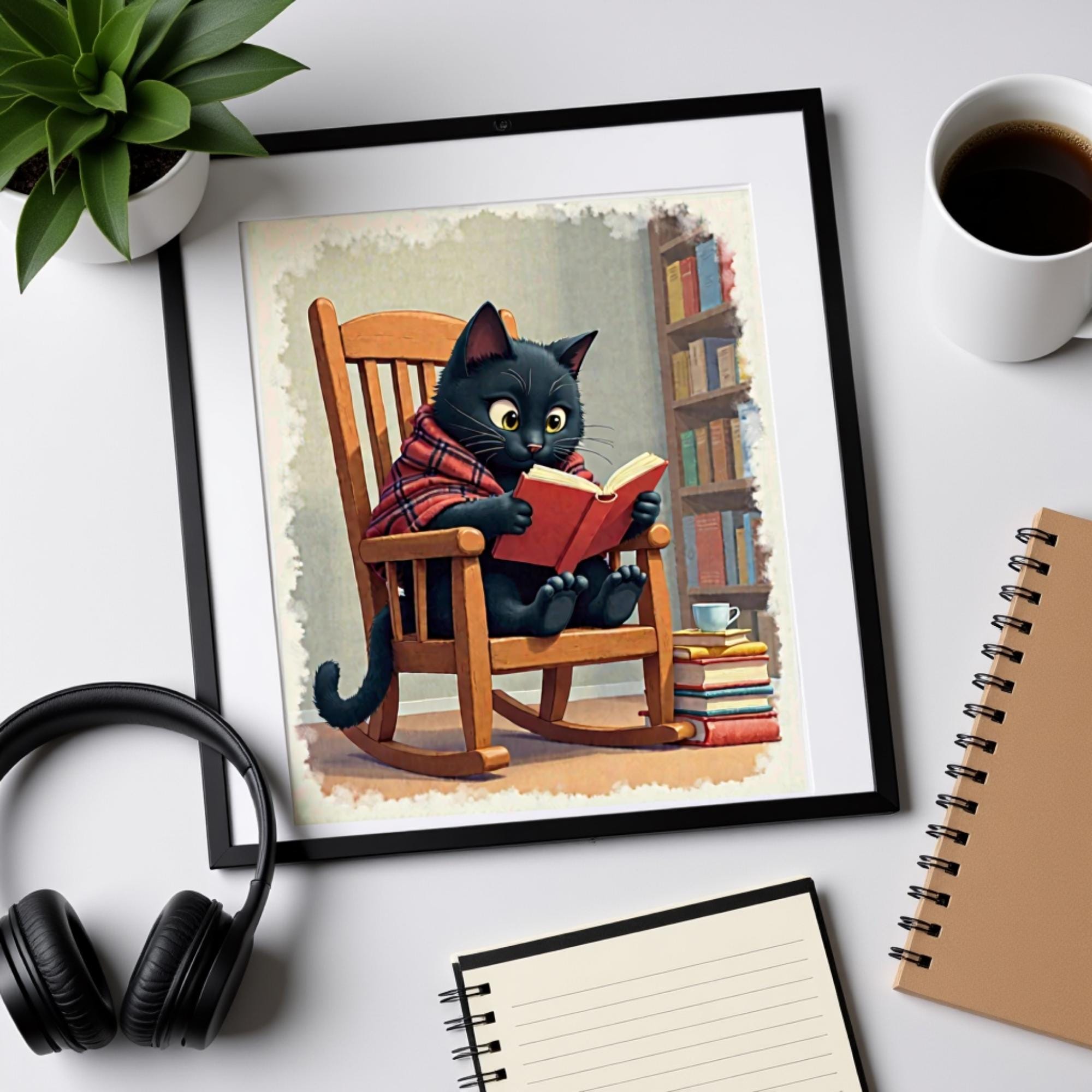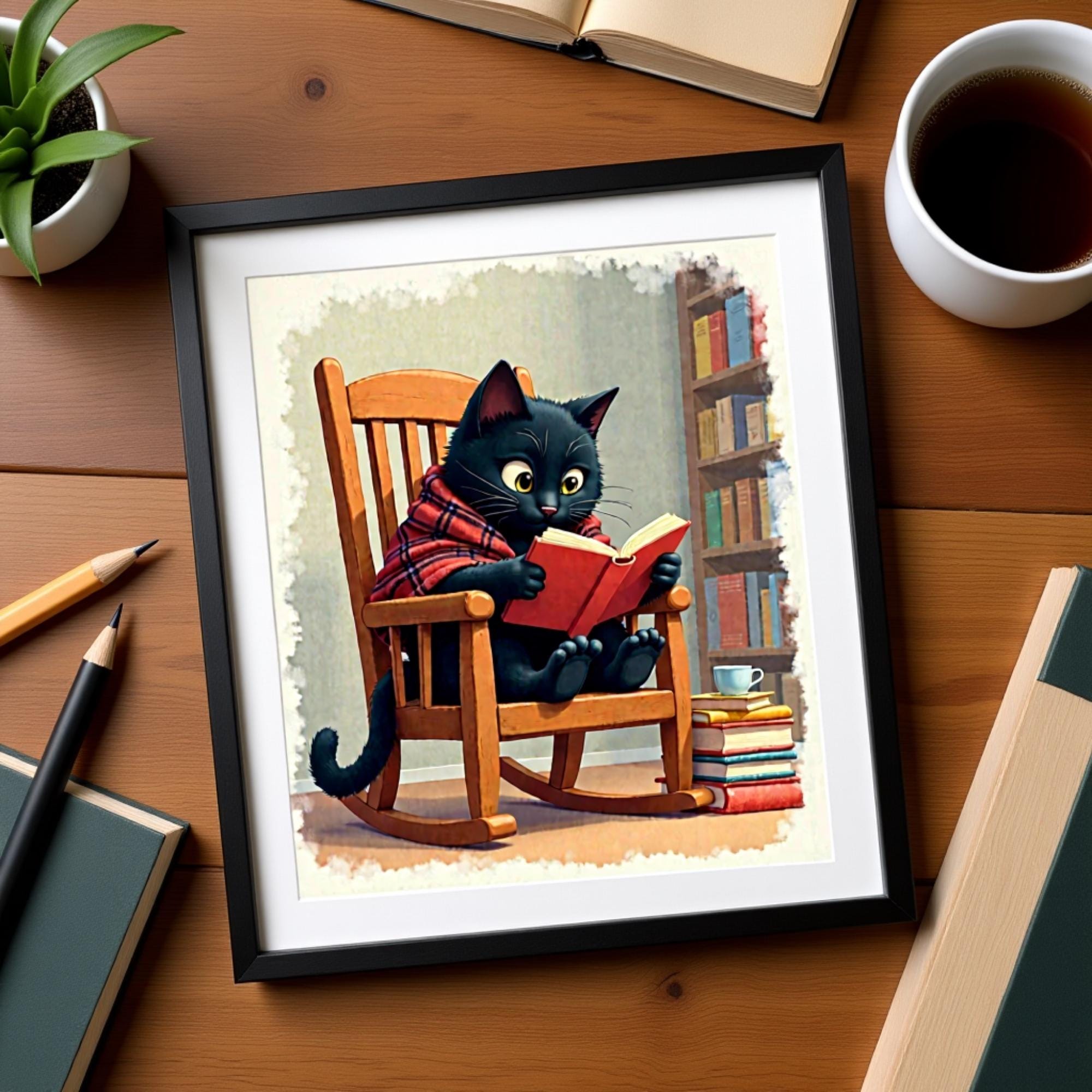 Crafted with care by The Turquoise Arts, this printable artwork brings a playful yet calming vibe to any space. The detailed illustration showcases a serene black cat wearing a plaid scarf, sitting in a wooden rocking chair surrounded by books and a warm, inviting atmosphere. This digital wall art is designed to inspire your love of reading and your affection for cats, making it a delightful addition to your decor.