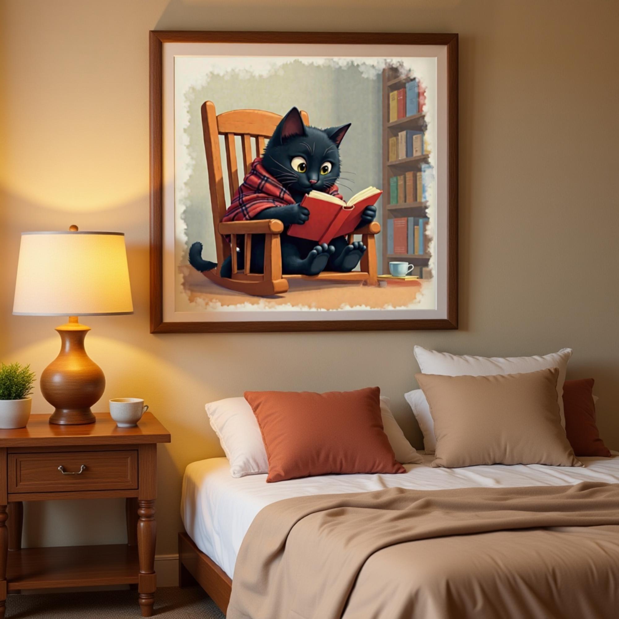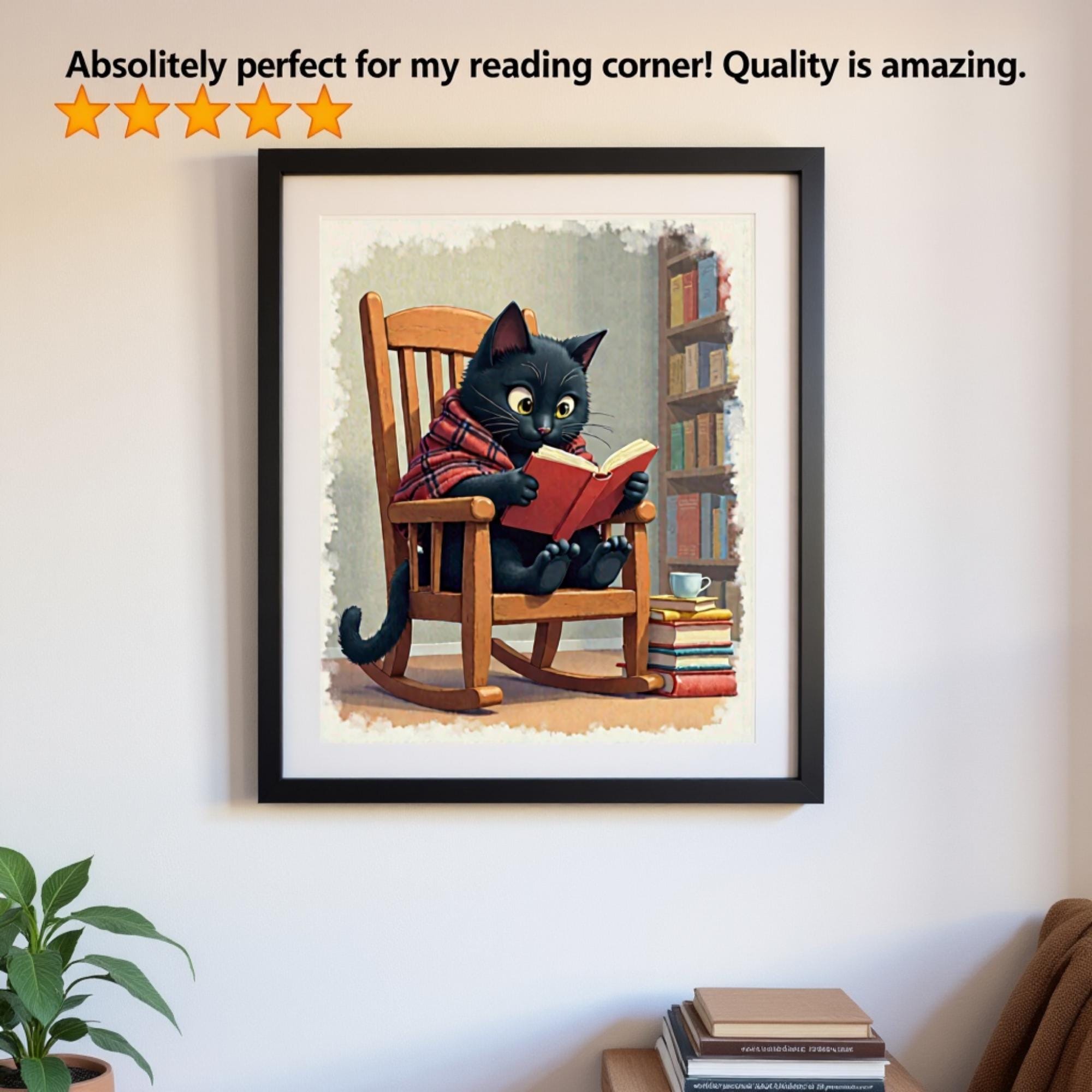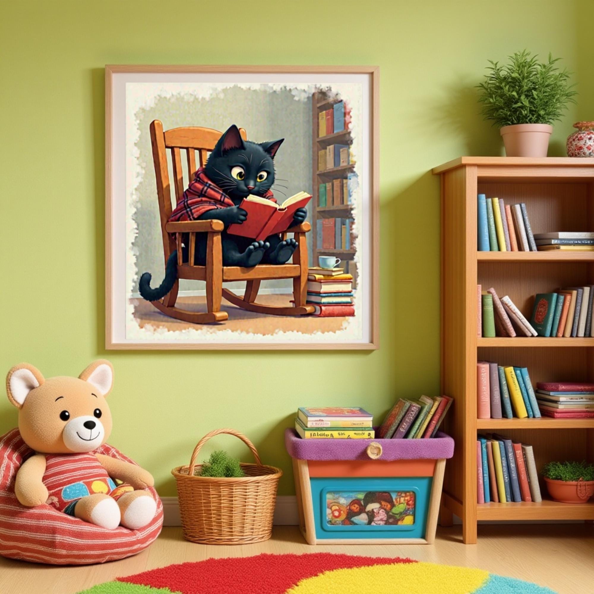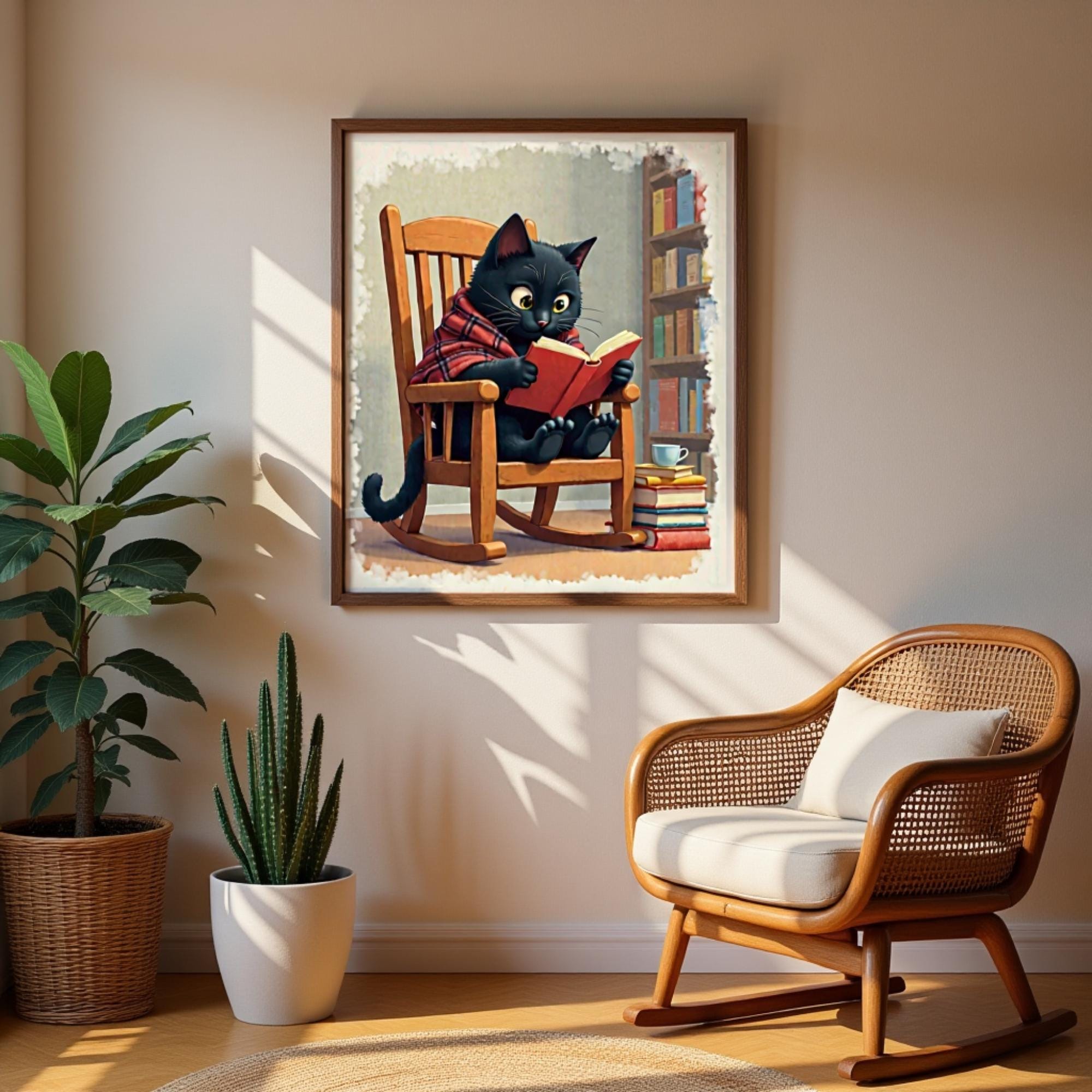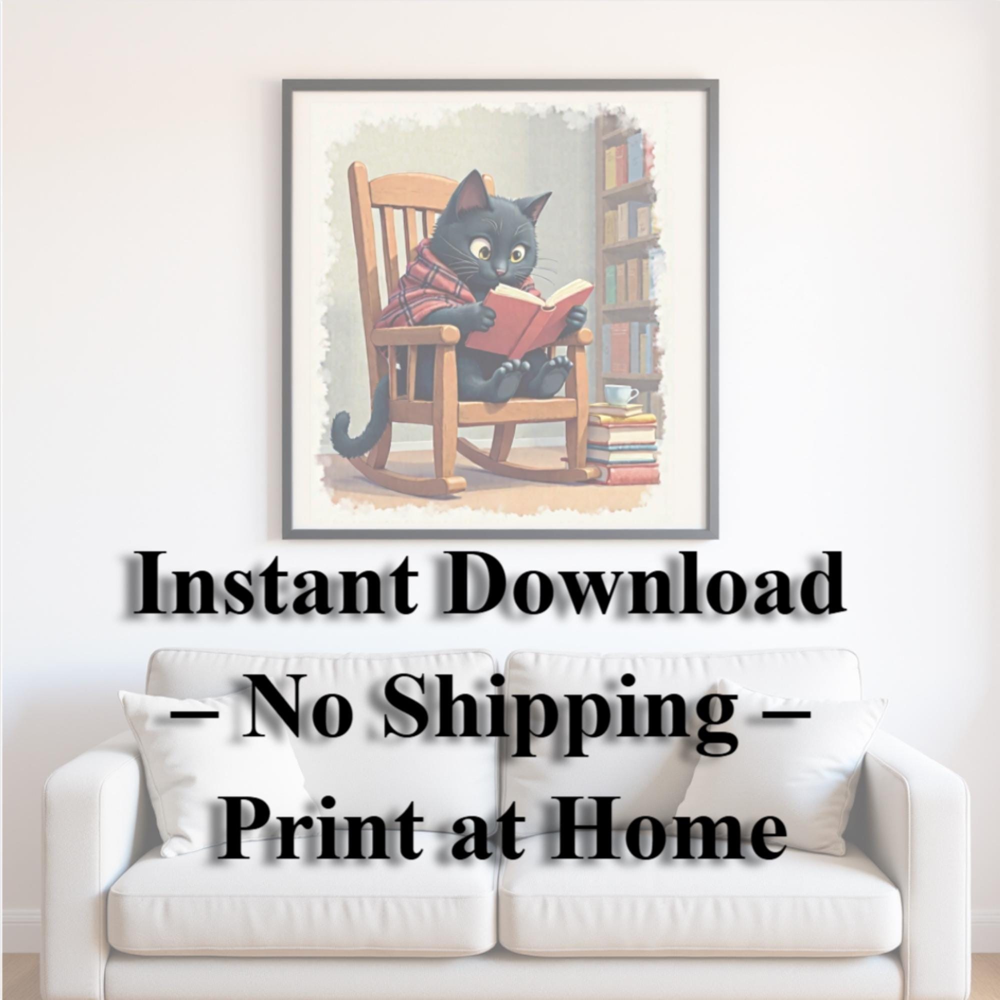 Crafted with care by The Turquoise Arts, this printable artwork brings a playful yet calming vibe to any space. The detailed illustration showcases a serene black cat wearing a plaid scarf, sitting in a wooden rocking chair surrounded by books and a warm, inviting atmosphere. This digital wall art is designed to inspire your love of reading and your affection for cats, making it a delightful addition to your decor.